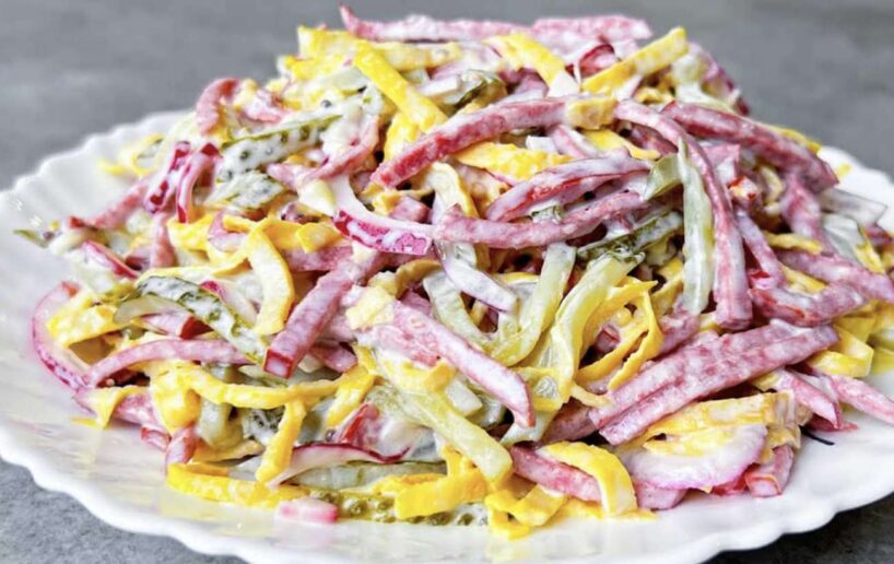 Desu var izvēlēties pēc savas gaumes — gan vieglāku vārītu, gan nedaudz izteiksmīgāku kūpinātu. Gurķu skābums un sāļums piešķir salātiem atsvaidzinājumu, tāpēc ieteicams tos nepārslogot ar majonēzi, lai garšas nav pārāk smagas.