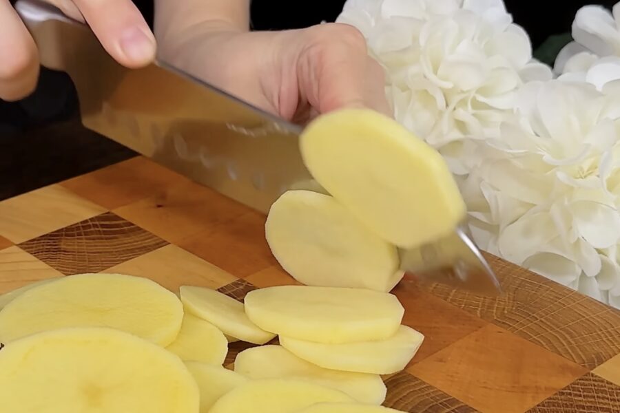 Lai šīs vakariņas izdotos tiešām gardas, kartupeļus nevajadzētu griezt rupjos gabalos. Es parasti izvēlos vidēja izmēra bumbuļus un griežu tos plānās ripulīšos, apmēram puscentimetru biezos. Šāds biezums ļauj kartupelim pannā izcepties ātri, bet tajā pašā laikā tam izveidojas kraukšķīga, zeltaina maliņa.