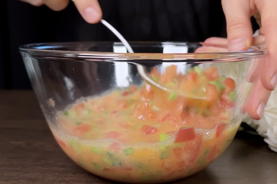Mērcei klāt es vienmēr pieberu nedaudz zaļumu. Ziemā tie visbiežāk ir lociņi, kas izauguši uz palodzes, vai smalki sakapātas dilles. Zaļumi piešķir to vajadzīgo svaigumu, kura ziemā mēdz pietrūkt. Vēl klāt pievienoju šķipsniņu sāls, piparus un nedaudz kaltētu ķiploku. Tas viss kopā rada aromātu, kas tūlīt pat liek sasaukt visus mājiniekus pie galda.